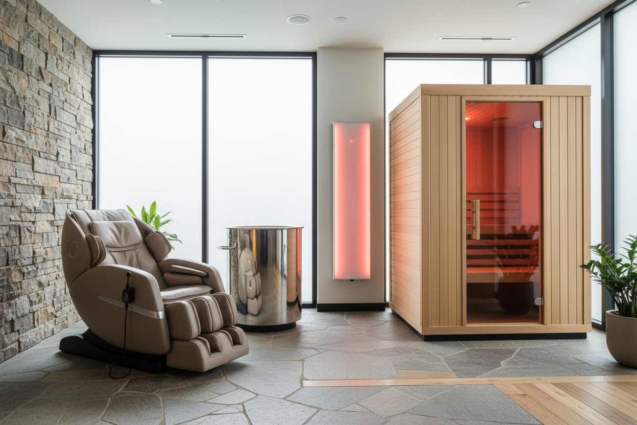 A modern wellness space shaped for those who value deeper restoration and mindful optimization. The environment blends gentle warmth with targeted rejuvenation, creating a setting that supports clarity, energy, and daily resilience.